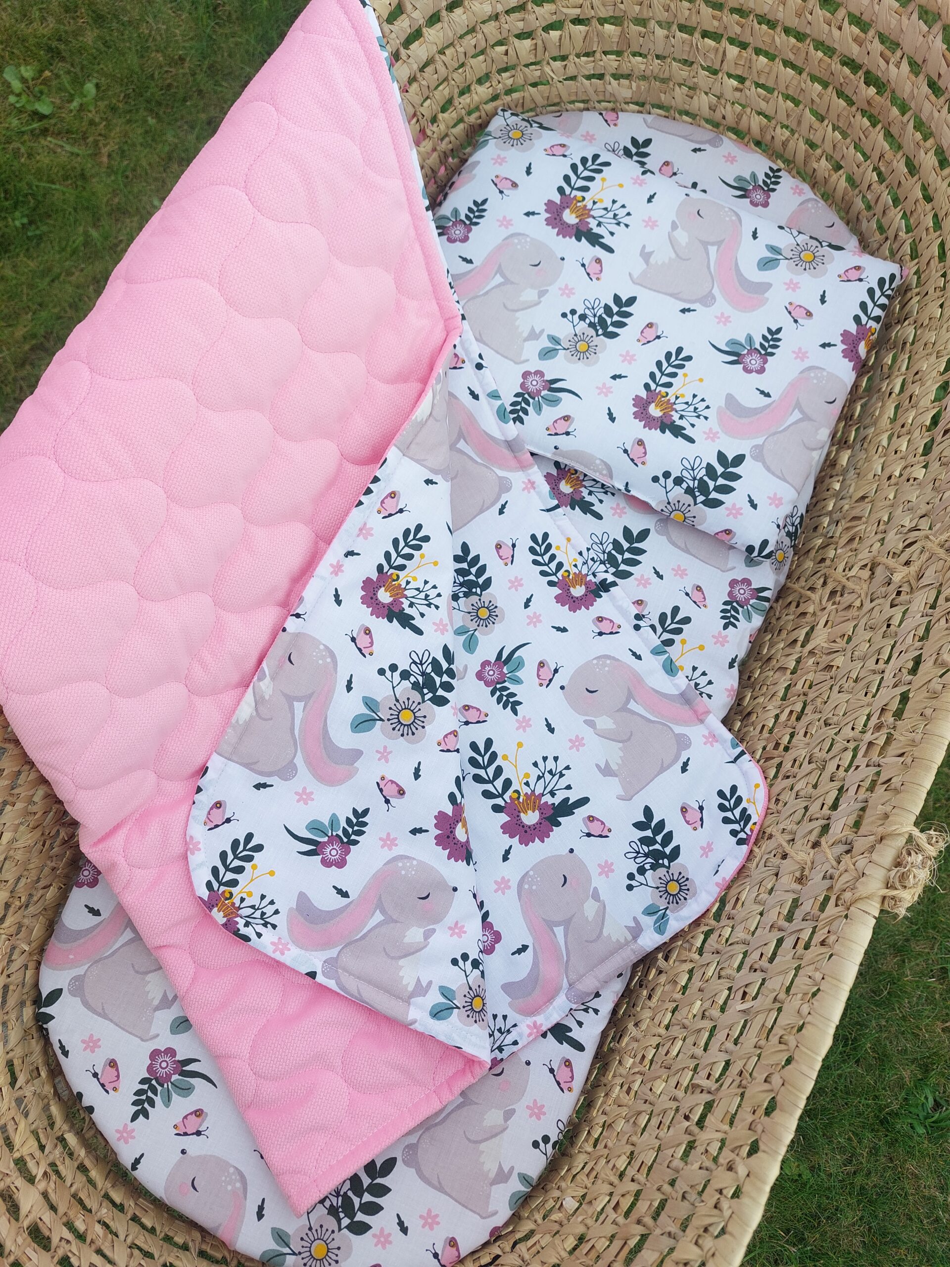 Vežimėlio rinkinys „Zuikiai su drugeliais“ – pledas su pašiltinimu, pagalvėlė ir paklodė su guma – tai daugiau nei tekstilė. Tai šiluma, kurią dovanojate savo kūdikiui kasdien.