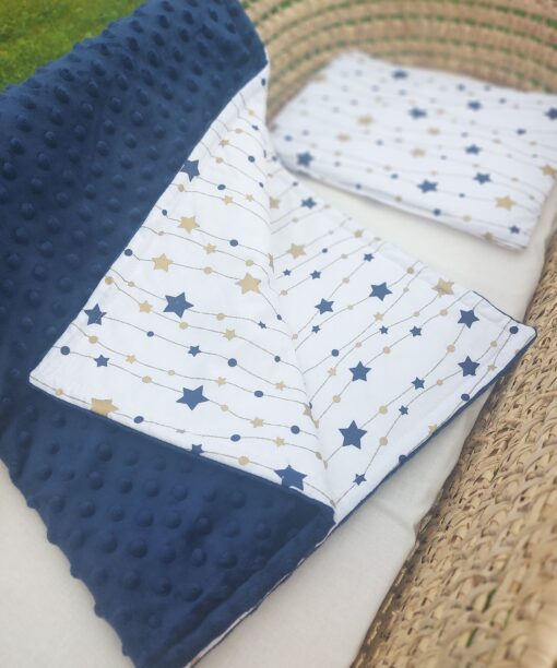 Vežimėlio rinkinys „Smulkios žvaigždės“ – pledas su pašiltinimu, pagalvėlė ir paklodė su guma – tai daugiau nei tekstilė. Tai šiluma, kurią dovanojate savo kūdikiui kasdien.