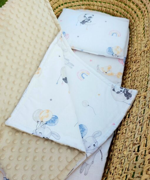 Vežimėlio rinkinys „Smulkios žvaigždės“ – pledas su pašiltinimu, pagalvėlė ir paklodė su guma – tai daugiau nei tekstilė. Tai šiluma, kurią dovanojate savo kūdikiui kasdien.
